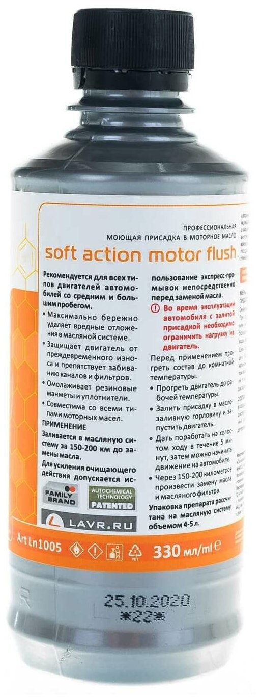 Моющая присадка в масло Lavr Soft Action Motor Flush, мягкая промывка бензиновых и дизельных двигателей, бутылка 330мл, арт. Ln1005
