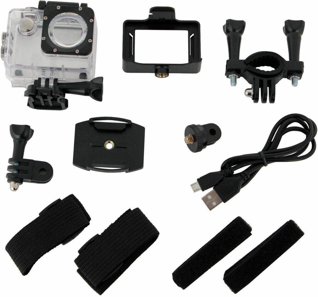 | Плюсы: | Низкая цена,вполне неплохое качество записи видео,обширный набор креплений в комплекте. |