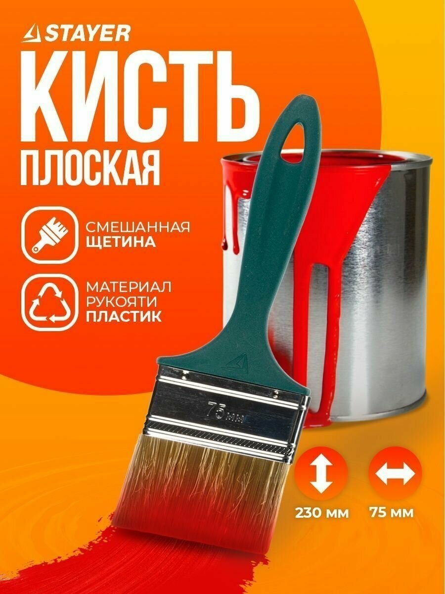 STAYER LASUR-EURO 75 мм, 3″ смешанная щетина, пластмассовая ручка, Плоская кисть (01081-75)