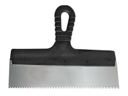 Шпатель из стали, 200 мм, зуб 4 х 4 мм, пластмассовая ручка.