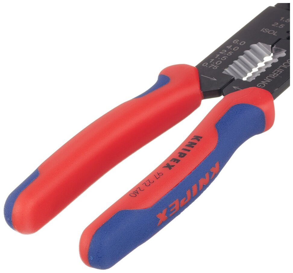 Пресс-клещи для резки и зачистки кабеля KNIPEX KN-9722240, опрессовки кабельных наконечников и штекеров, 3 гнезда, обжим кабельных наконечников с изолятором и кабельных соединителей: 0.5-6.0 мм² (AWG 20 - 10), j, обжим штекеров открытых неизолированных ши
