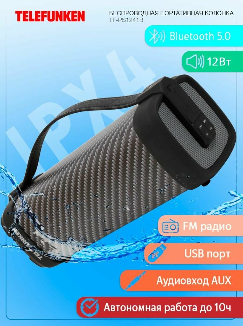 Портативная колонка Telefunken TF-PS1241B, 12Вт, 1500мАч, FM, BT, microSD, IPХ4,AUX, принт 2