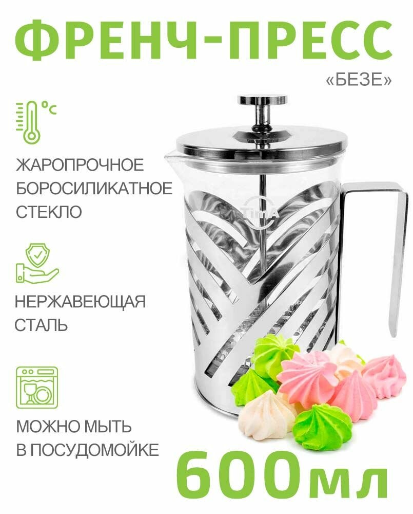 Френч-пресс 0,6л TIMA Безе из нержавеющей стали и боросиликатного стекла интересное: