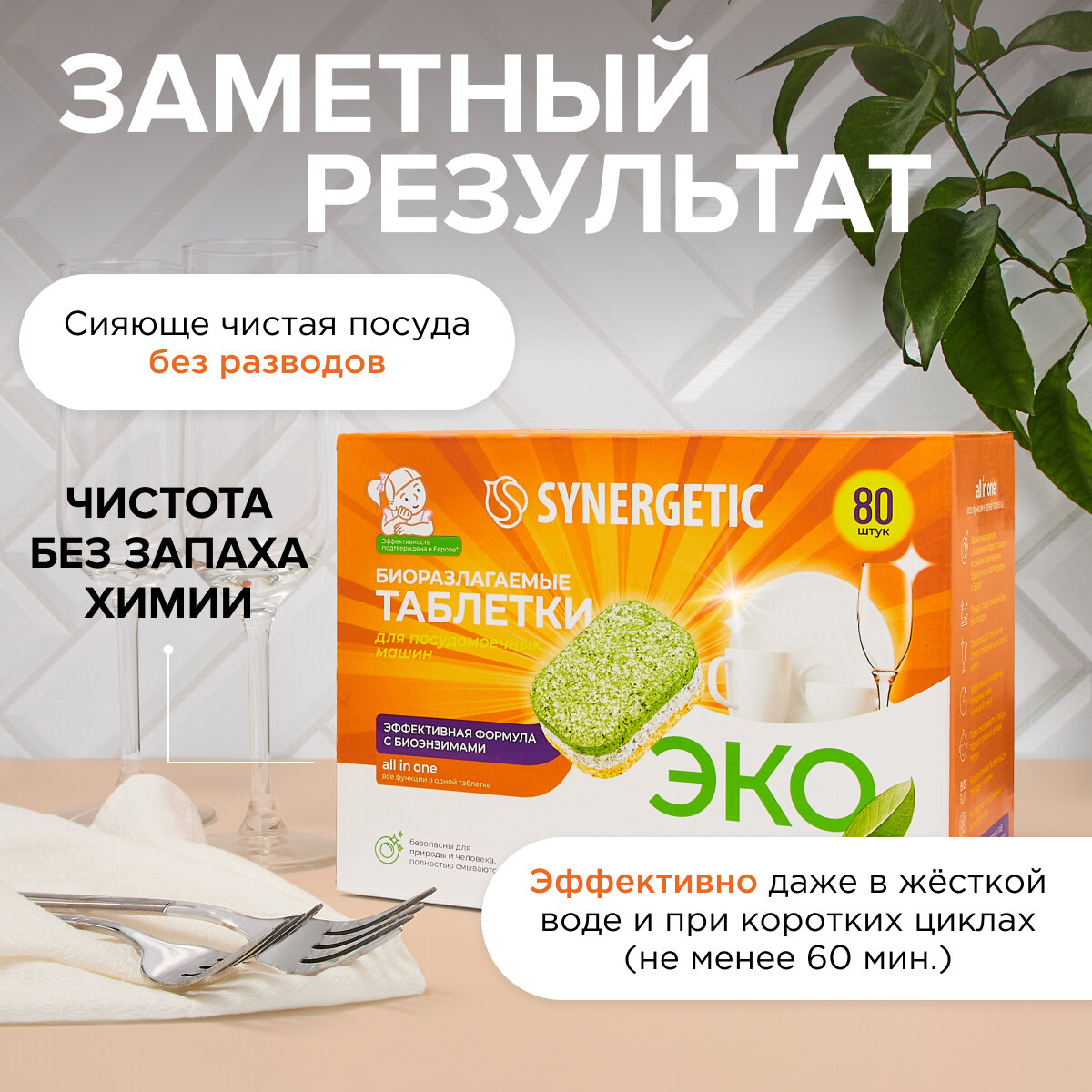 Купить Биоразлагаемые бесфосфатные таблетки для посудомоечных машин SYNERGETIC в водорастворимой пленке, 80 шт.