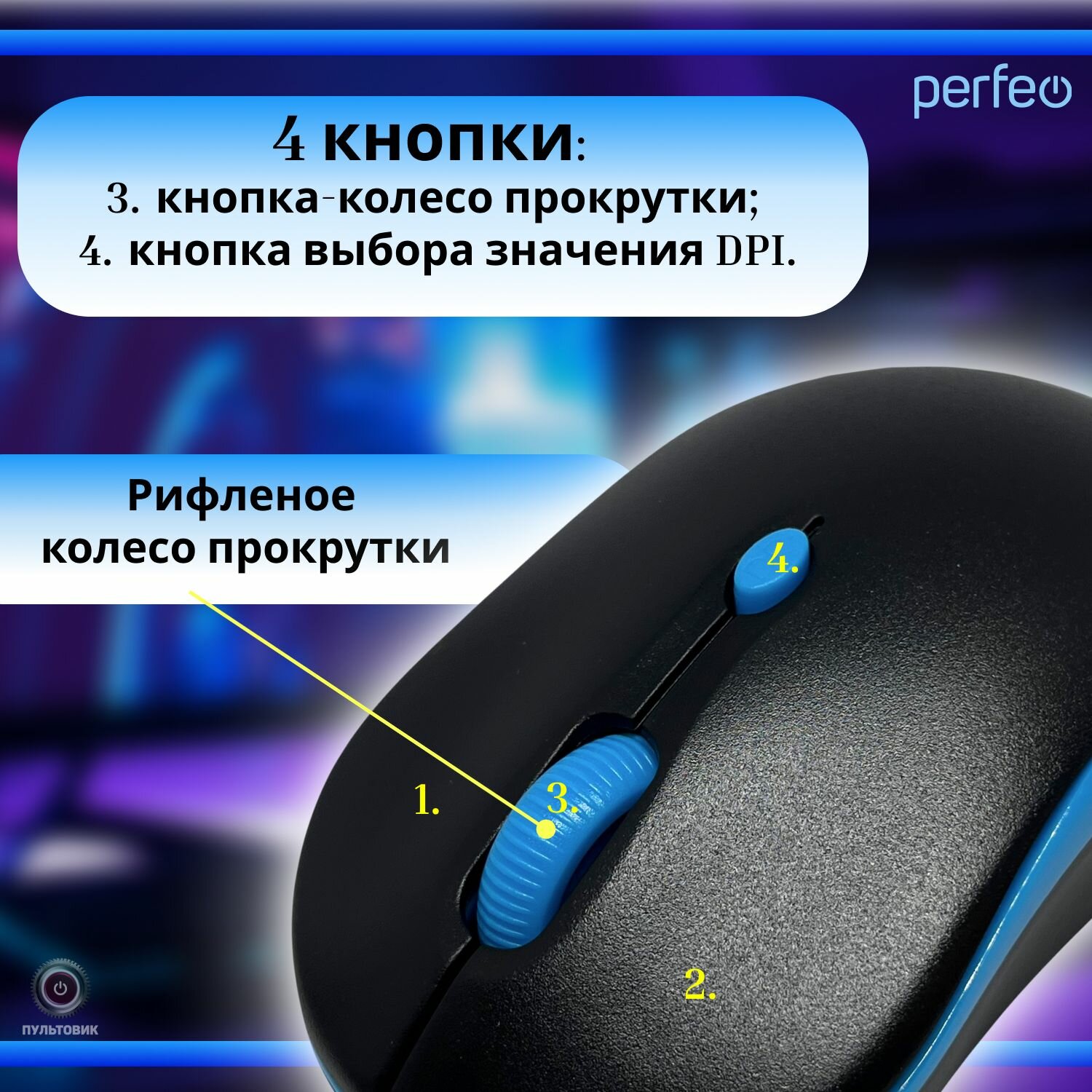 Мышь Perfeo оптическая "MOUNT", 4 кн, DPI 800-1600, USB, чёрн/голубая