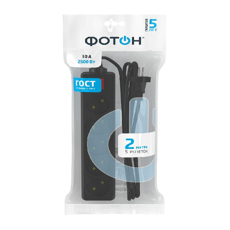 Удлинитель сетевой "фотон" 10-25S, 2м, 5 розеток, черный, ГОСТ