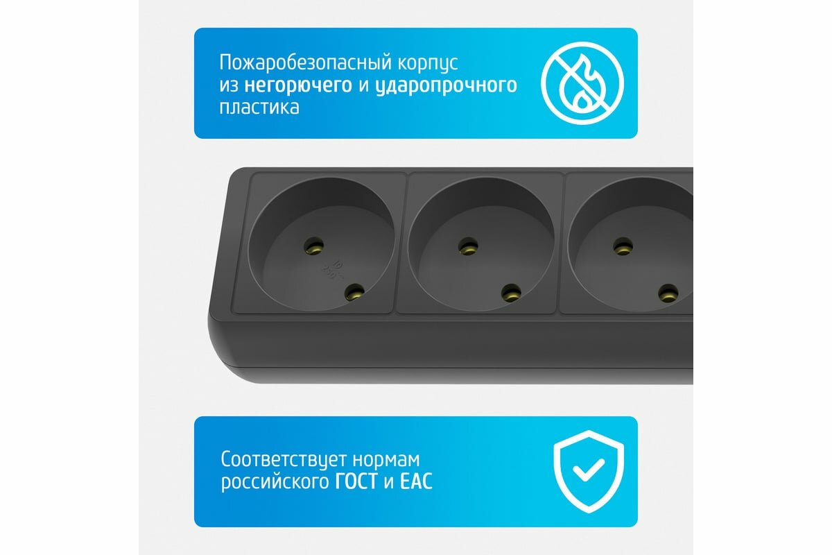 Удлинитель сетевой для розетки, удлинитель для гирлянды фотон 10А 2м 5 розеток с выключателем черный, ГОСТ