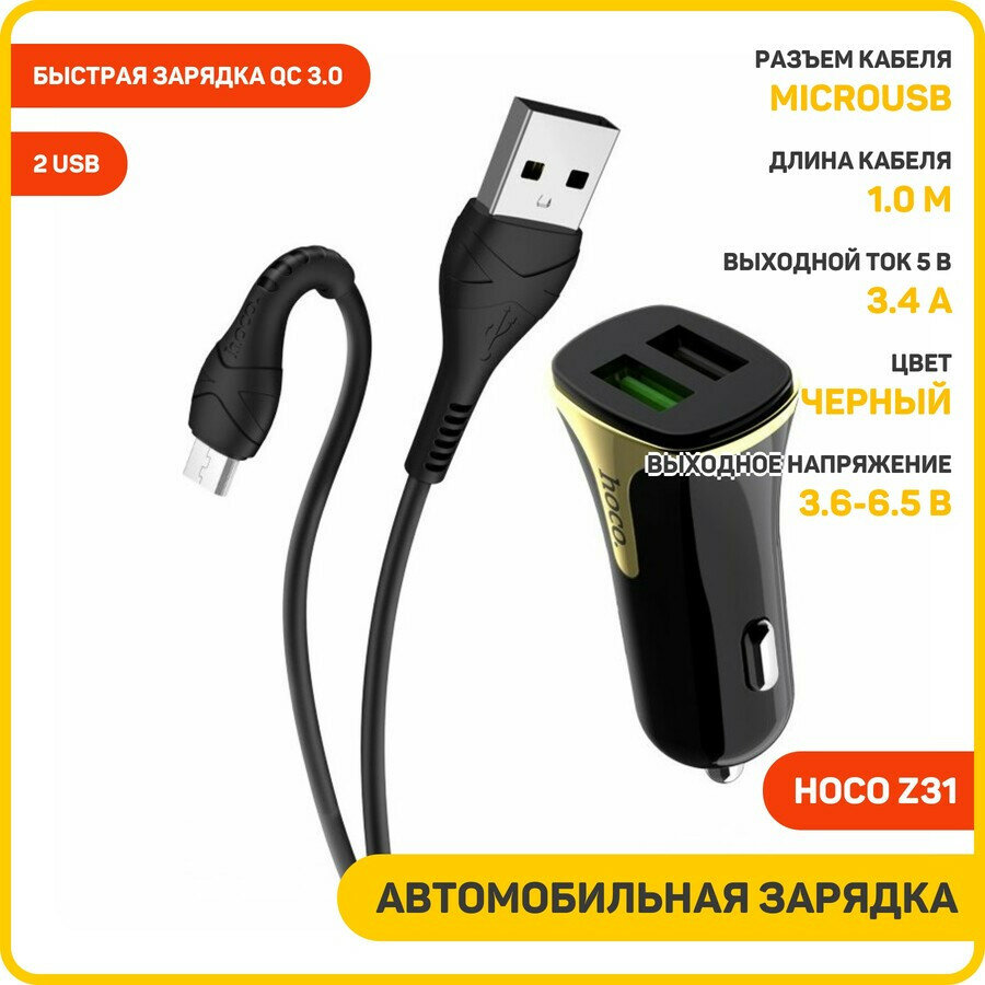 Автомобильное зарядное устройство (АЗУ) Hoco Z31 QC 3.0 (2 USB) + кабель MicroUSB, 3.4 А, черный