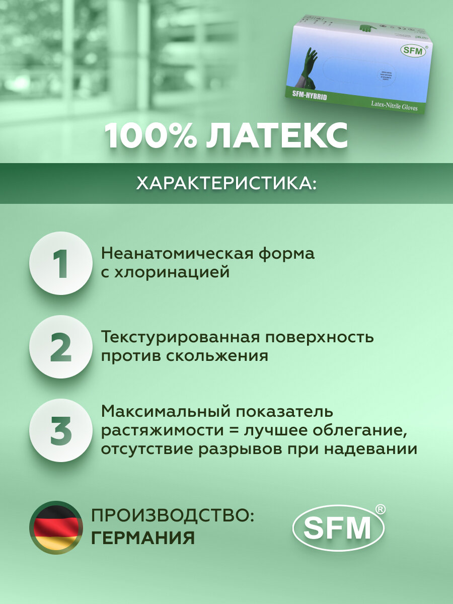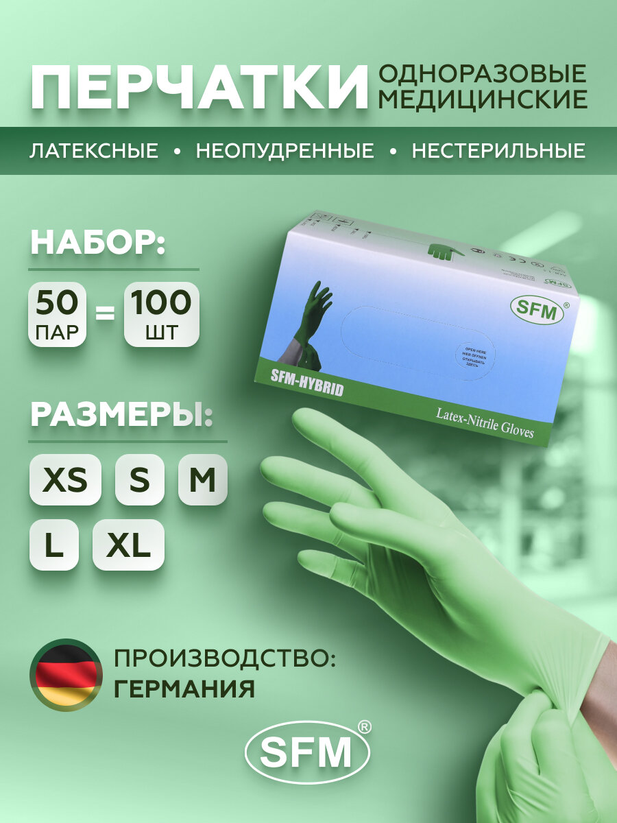 Перчатки одноразовые латексные смотровые SFM, нестерильные, опудренные, размер L, 50 пар