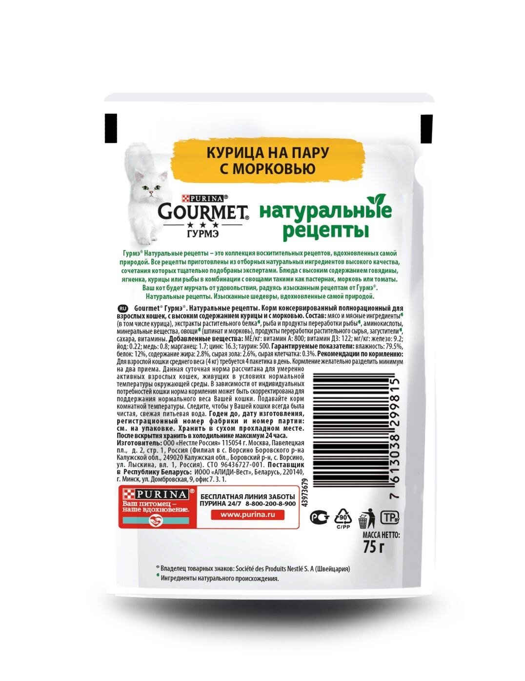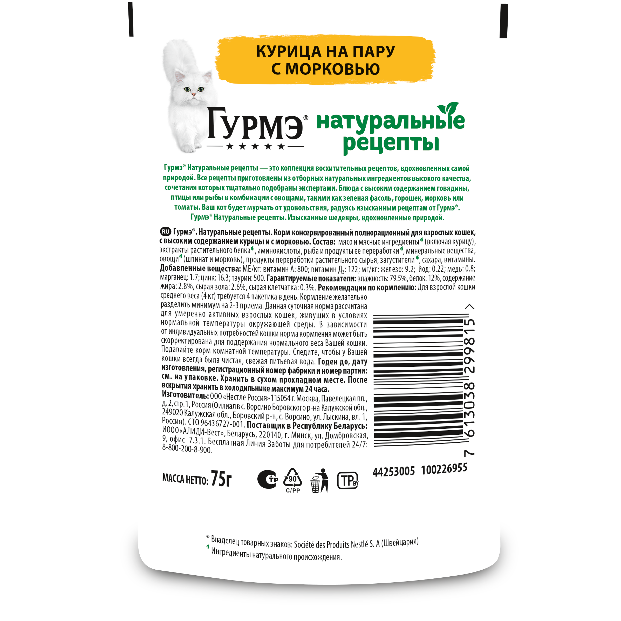 Купить Гурмэ Натуральные рецепты пауч для кошек Курица и морковь, 75 г. упаковка 26 шт