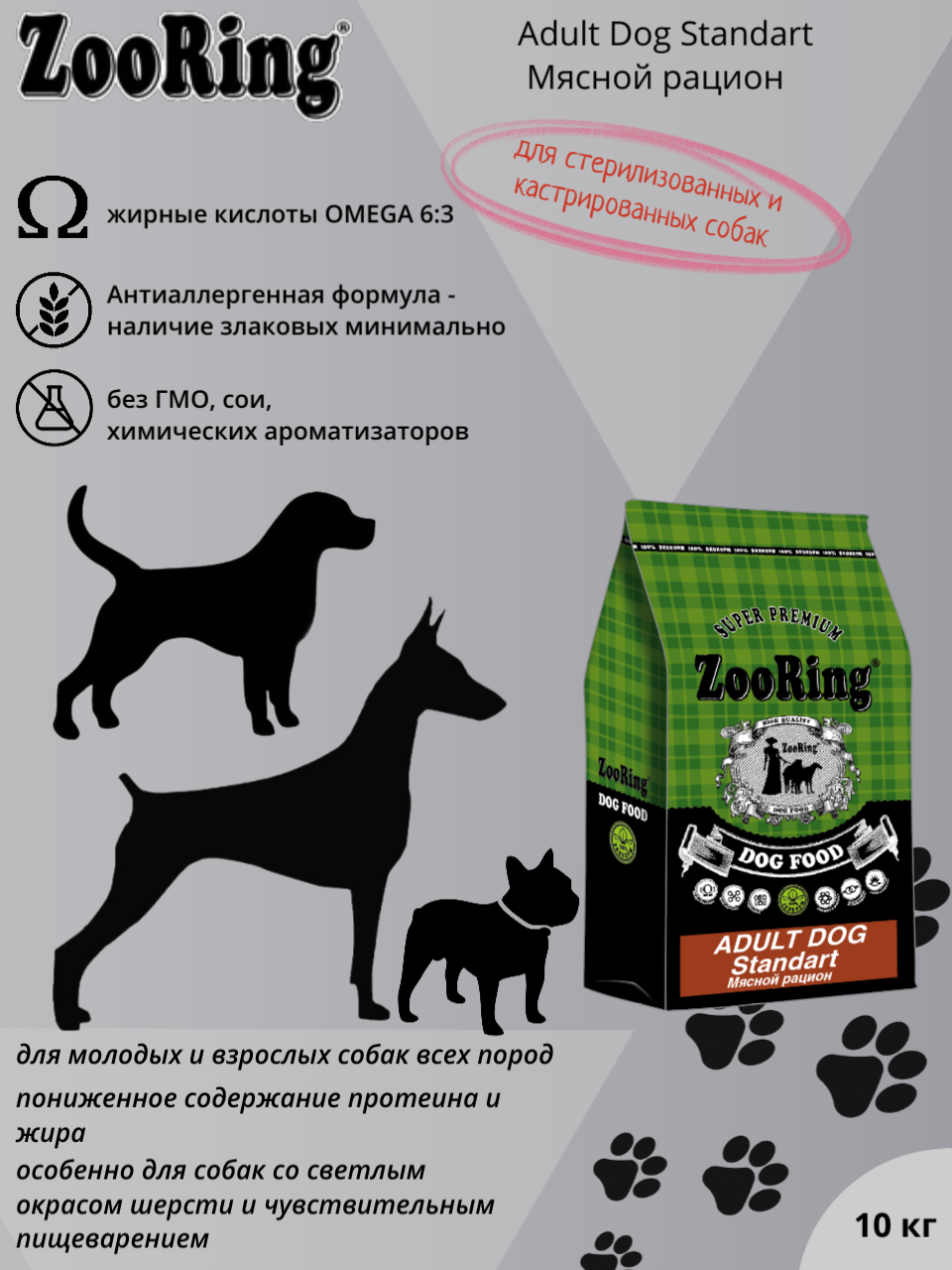 [33796] Корм ZooRing для собак Adult Dog Standart мясной рацион 10 кг, 33796 (1 шт)
