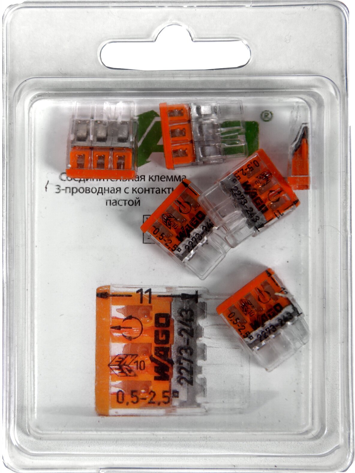 Клеммная колодка Wago 2273-243 без винтов 3 отверстия 0.5-2.5 мм2 с пастой (комплект из 5 шт.)
