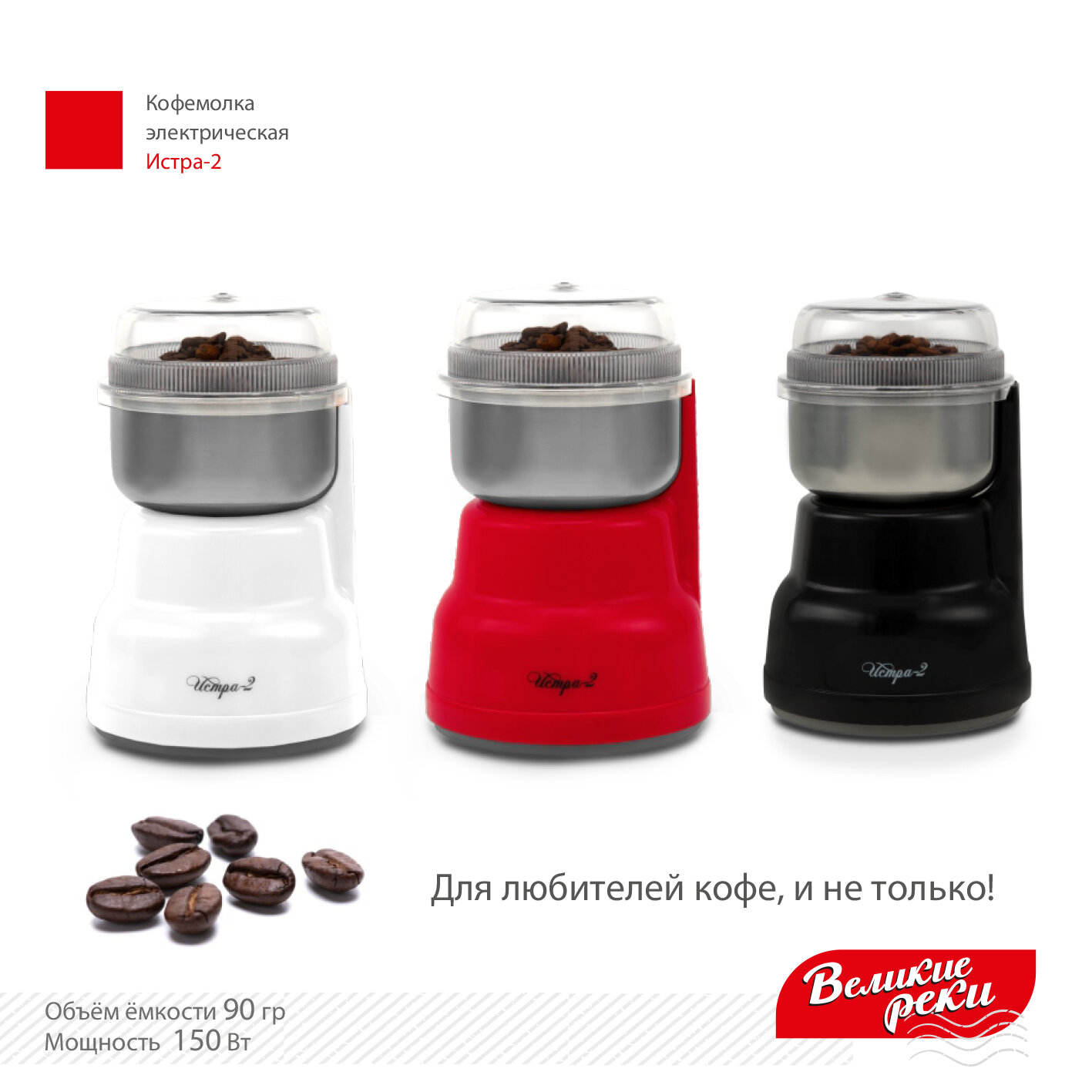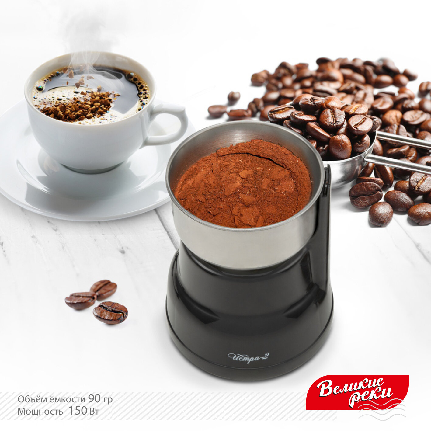 Кофемолка Великие реки Истра-2, цвет белый, чаша на 90 г, уникальная конструкция ножа из 4 лепестков, 150 Вт