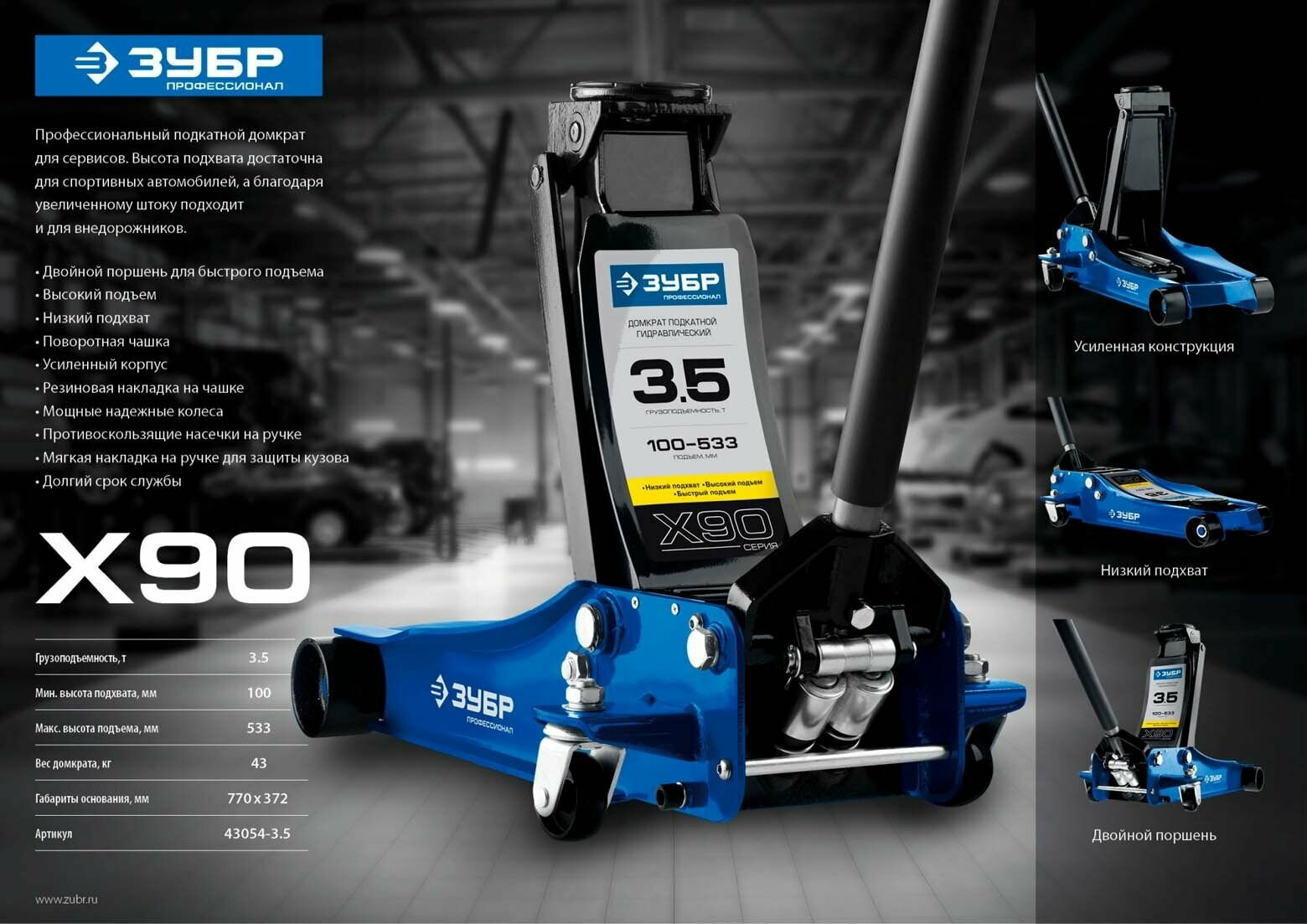 Универсальный подкатной гидравлический домкрат для СТО ЗУБР Профессионал X90 3.5т 100-533мм 43054-3.5
