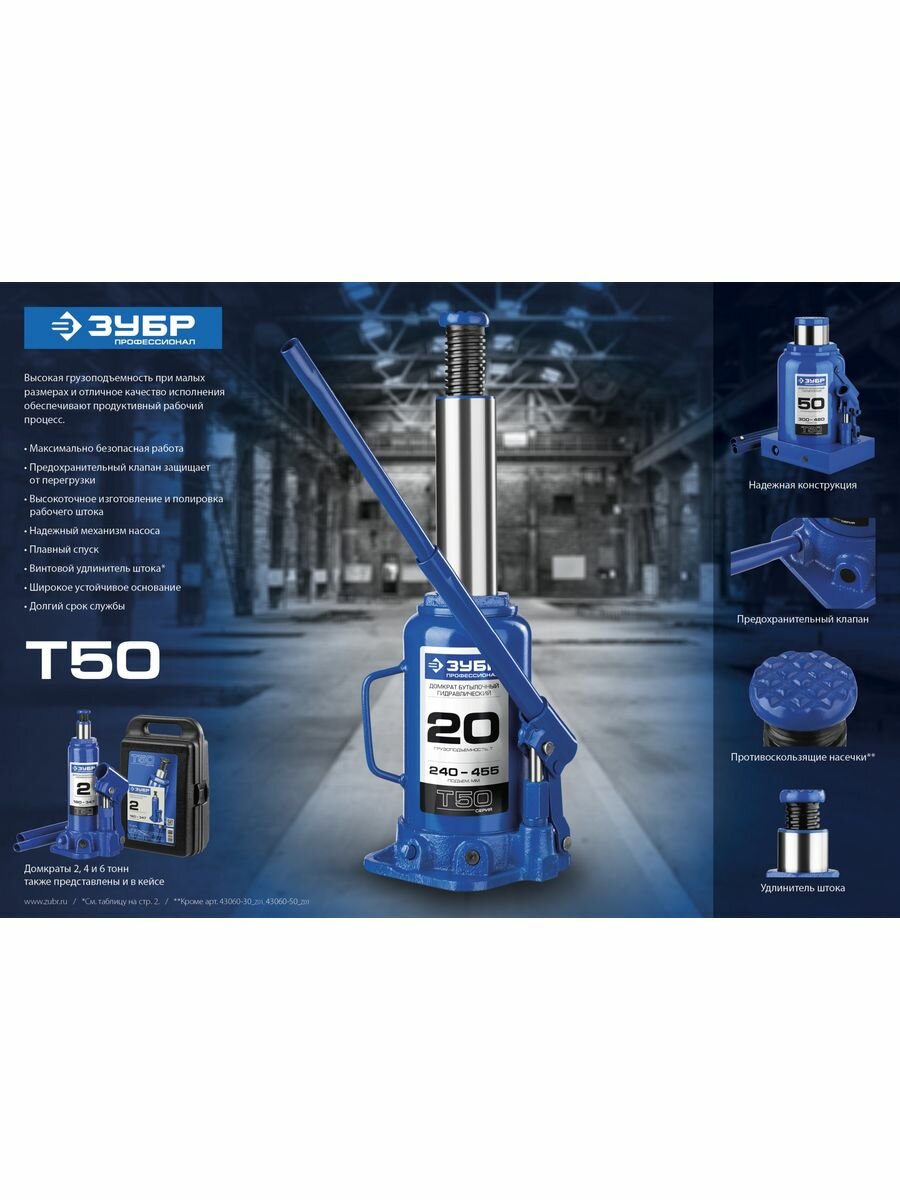Домкрат бутылочный гидравлический ЗУБР T50 43060-10_z01 (10 т) синий