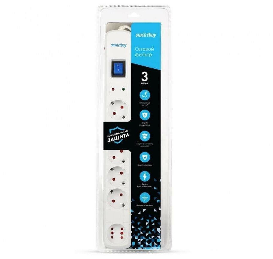 Удлинитель с функцией сетевого фильтра 16А, 3500 Вт, 6 гнезд, длина 3,0 м, белый, Smartbuy