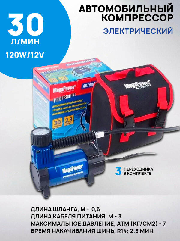 MEGAPOWER-AUTOMOTIVE M11040B Компрессор M-11040 BLUE поршневой 100PSI (30л/мин, 12А) в сумке 12V MEGAPOWER /1/10