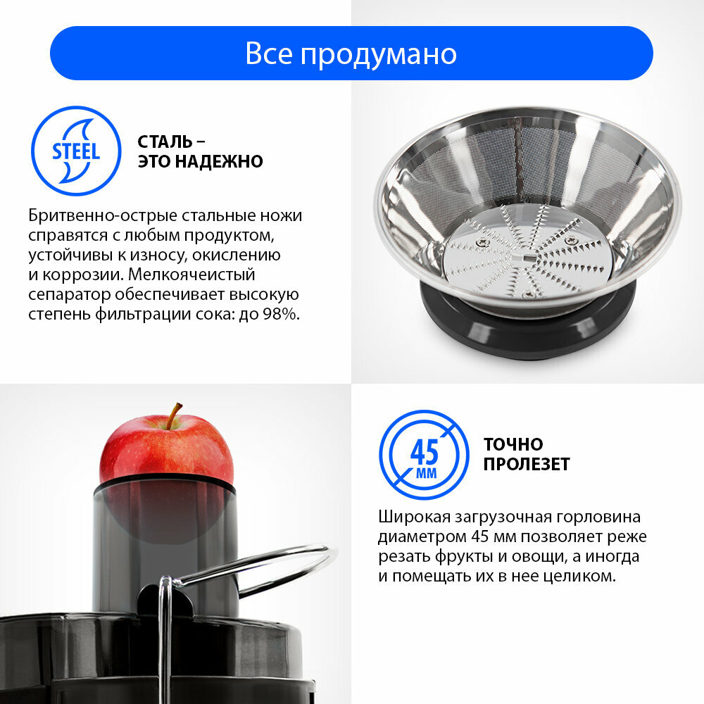 | Отзыв: | Меня модель устроила. Пользуюсь сейчас ей практически каждый день и она меня ни разу не подводила. Отдельно еще отмечу то, что она достаточно мощная. То есть, практически любые фрукты через нее проходят без проблем. В общем, за пару месяцев постоянного пользования вопросов не возникло. |