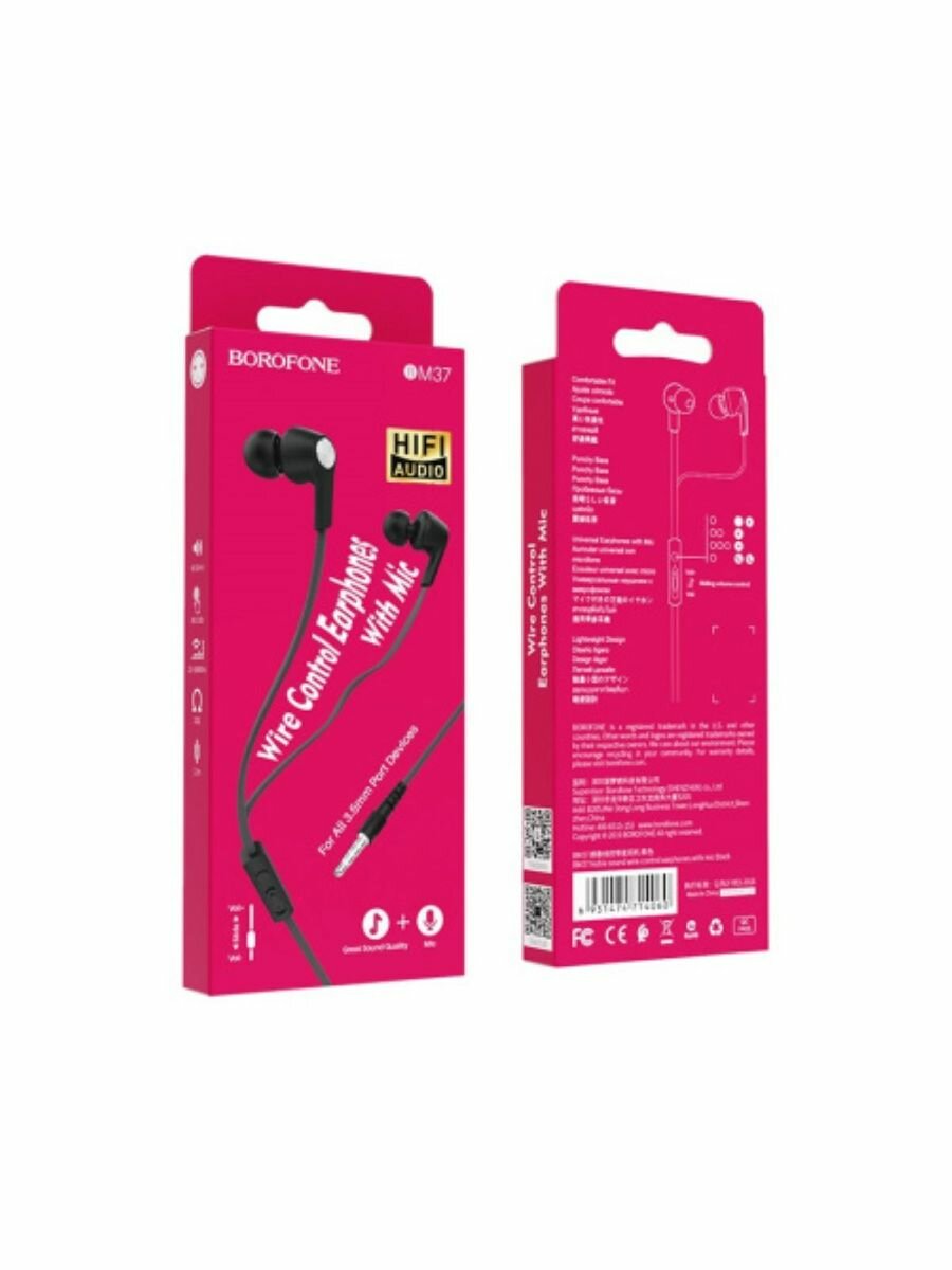 Наушники внутриканальные Borofone BM37, Noble, микрофон, кнопка ответа, регулятор громкости, цвет чёрный