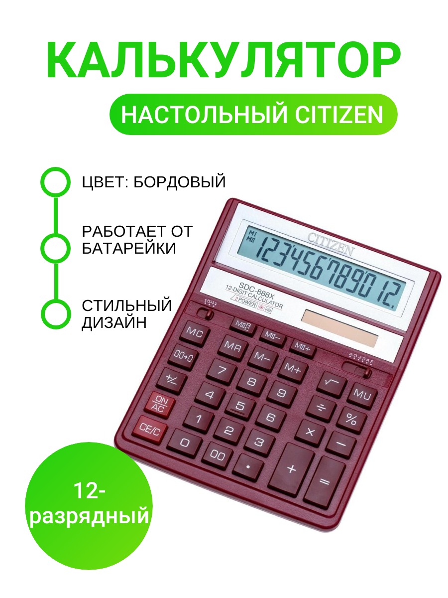 Калькулятор настольный Citizen полноразмерный, бухгалтерский, 12 разрядов, бордовый (SDC-888XRD)