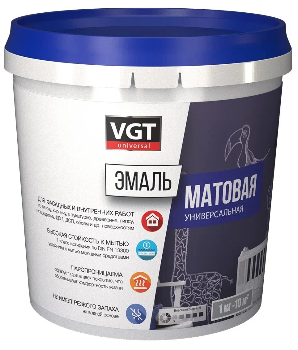 ВГТ эмаль акриловая матовая универсальная база А супербелая (1,5кг) / VGT эмаль акриловая матовая универсальная база А супербелая ВД-АК-1179 (1,5кг)
