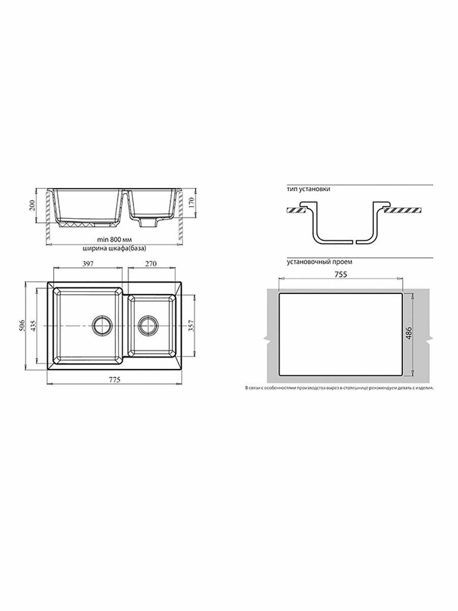 Мойка кухонная GranFest PRACTIK GF-P-780K 2 чаши 780*510 мм графит, мрамор