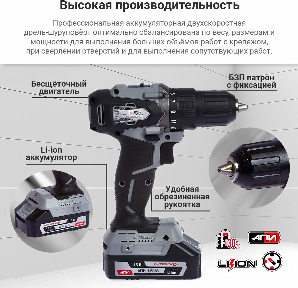 Бесщеточная аккумуляторная дрель-шуруповерт Интерскол ДА-13/18ВК АПИ (кейс, 2 аккум. 1,5Ач, ЗУ)
