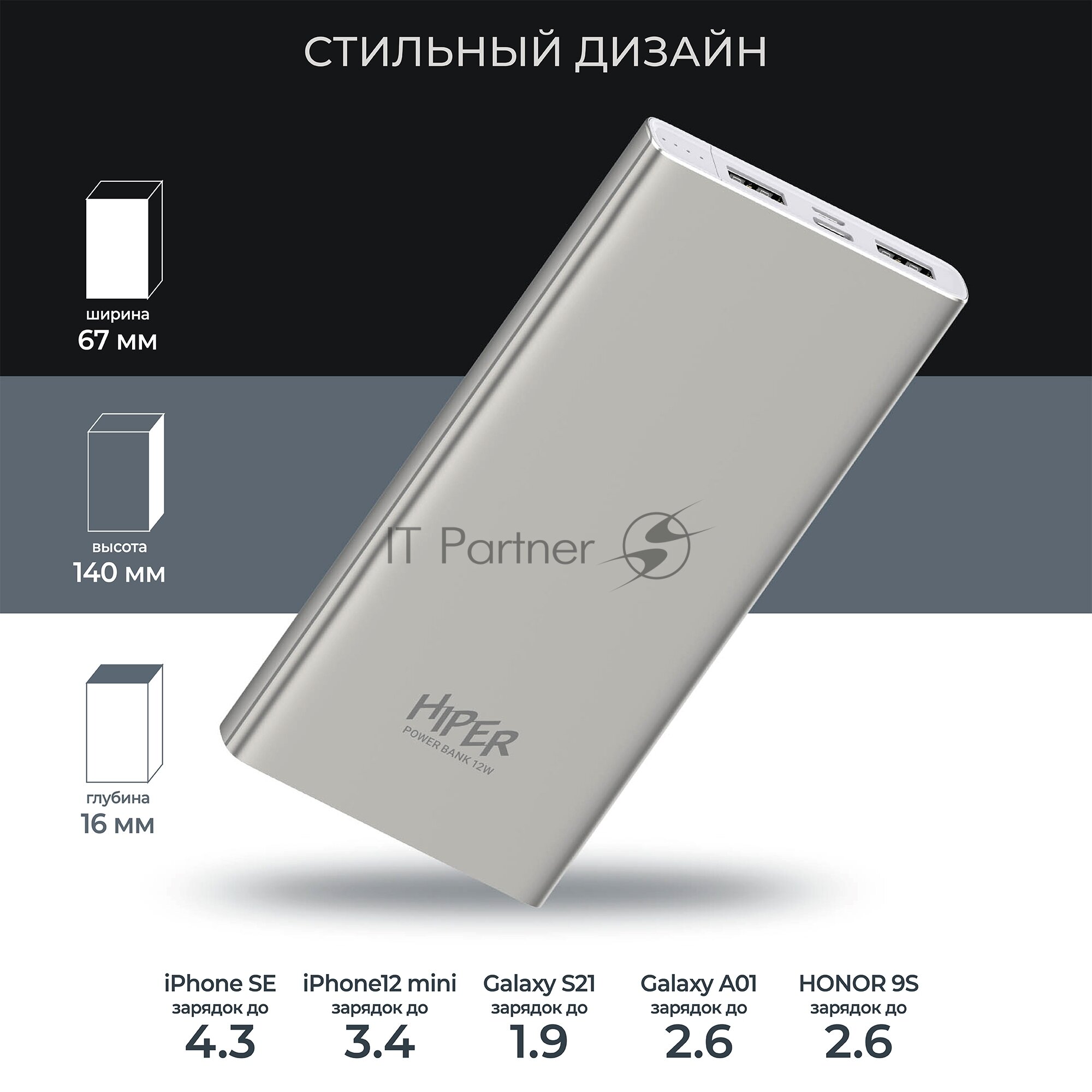 Hiper Metal 10K Space Gray Мобильный аккумулятор 10000mAh 2.4A 2xUSB темно-серый