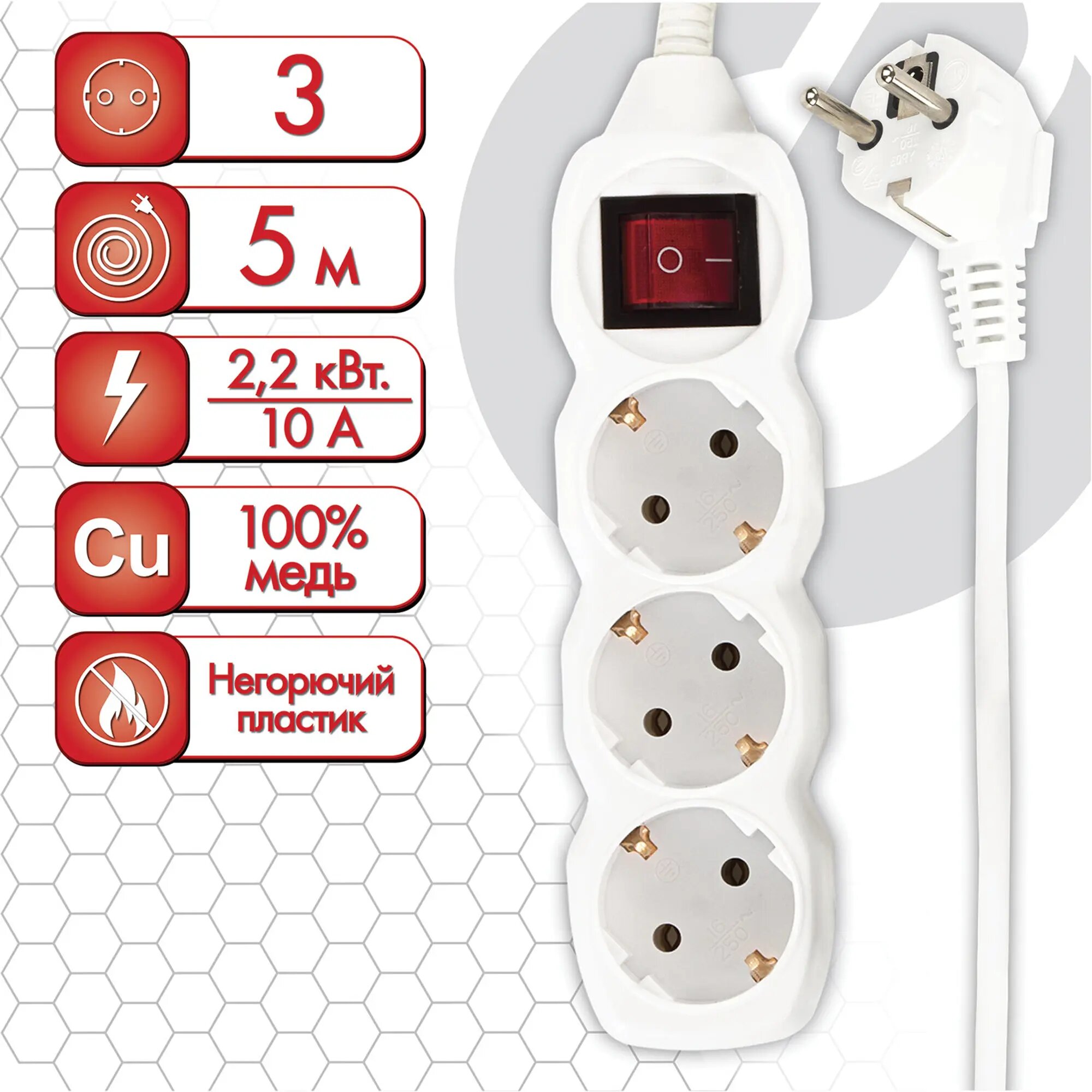 Удлинитель сетевой Sonnen U-135GS, 3 розетки, c заземлением, выключатель, 10 А, 5 м, белый (511435)