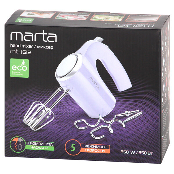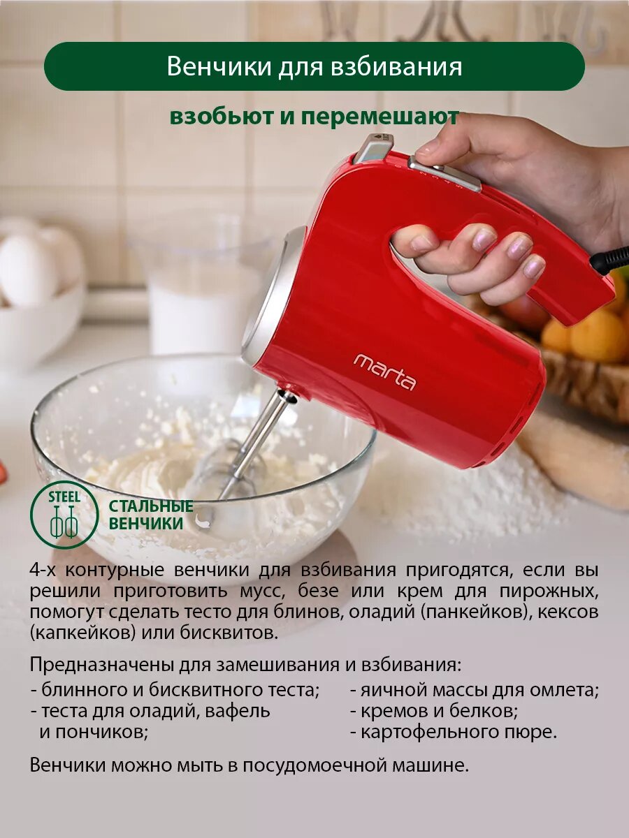 Миксер Marta MT-1512 красный рубин 350W 5 скоростных режимов, кнопка извлечения насадок, 2 комплекта .
