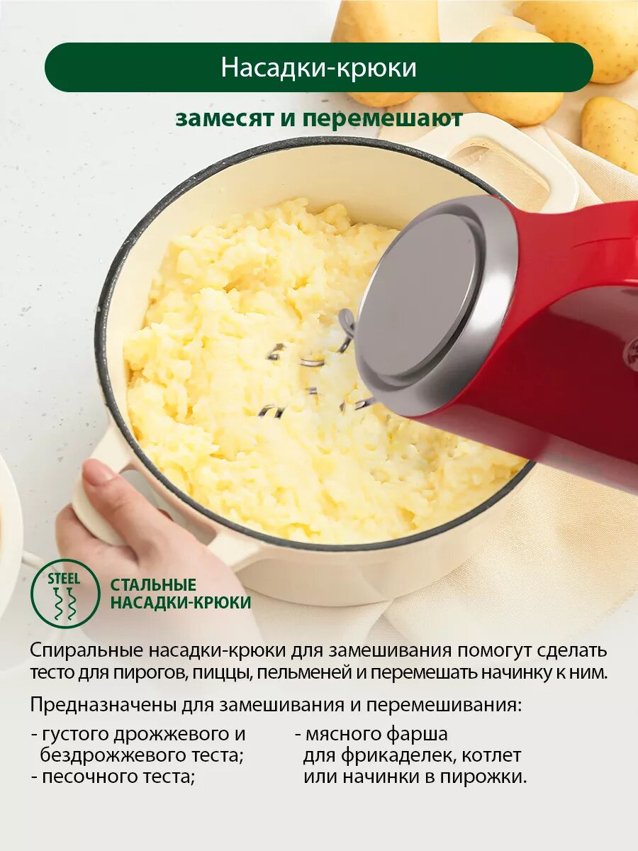 В комплекте помимо венчиков есть еще крюки для замешивания теста. Миксером замешивать тесто намного проще, чем вручную. |