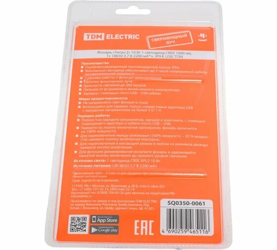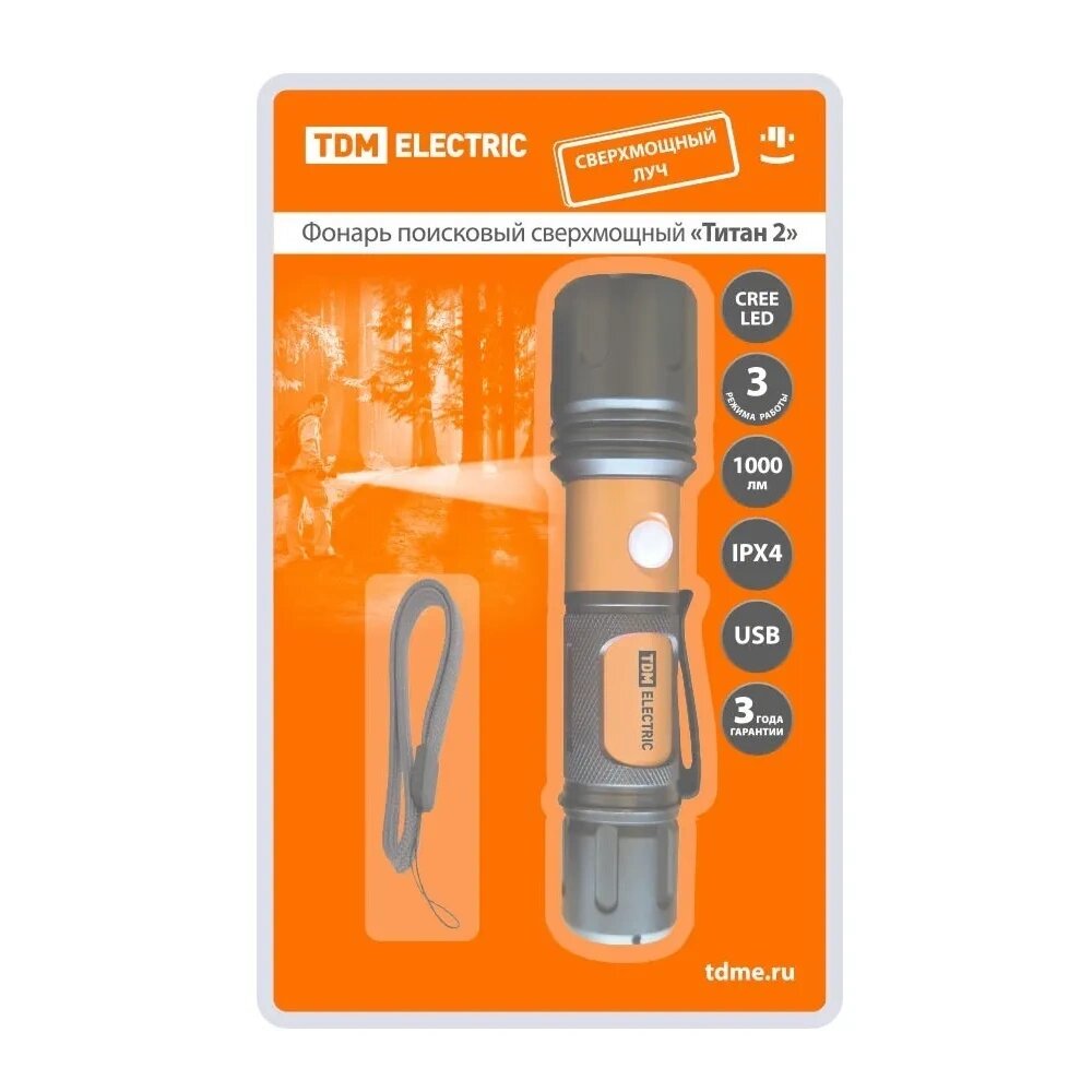 Купить Фонарь Tdm Electric «Титан 2» 10 Вт 1 светодиод CREE 1000 лм, 1х18650 3.7 В 2200 мА*ч , IPX4, USB, SQ0350-0061
