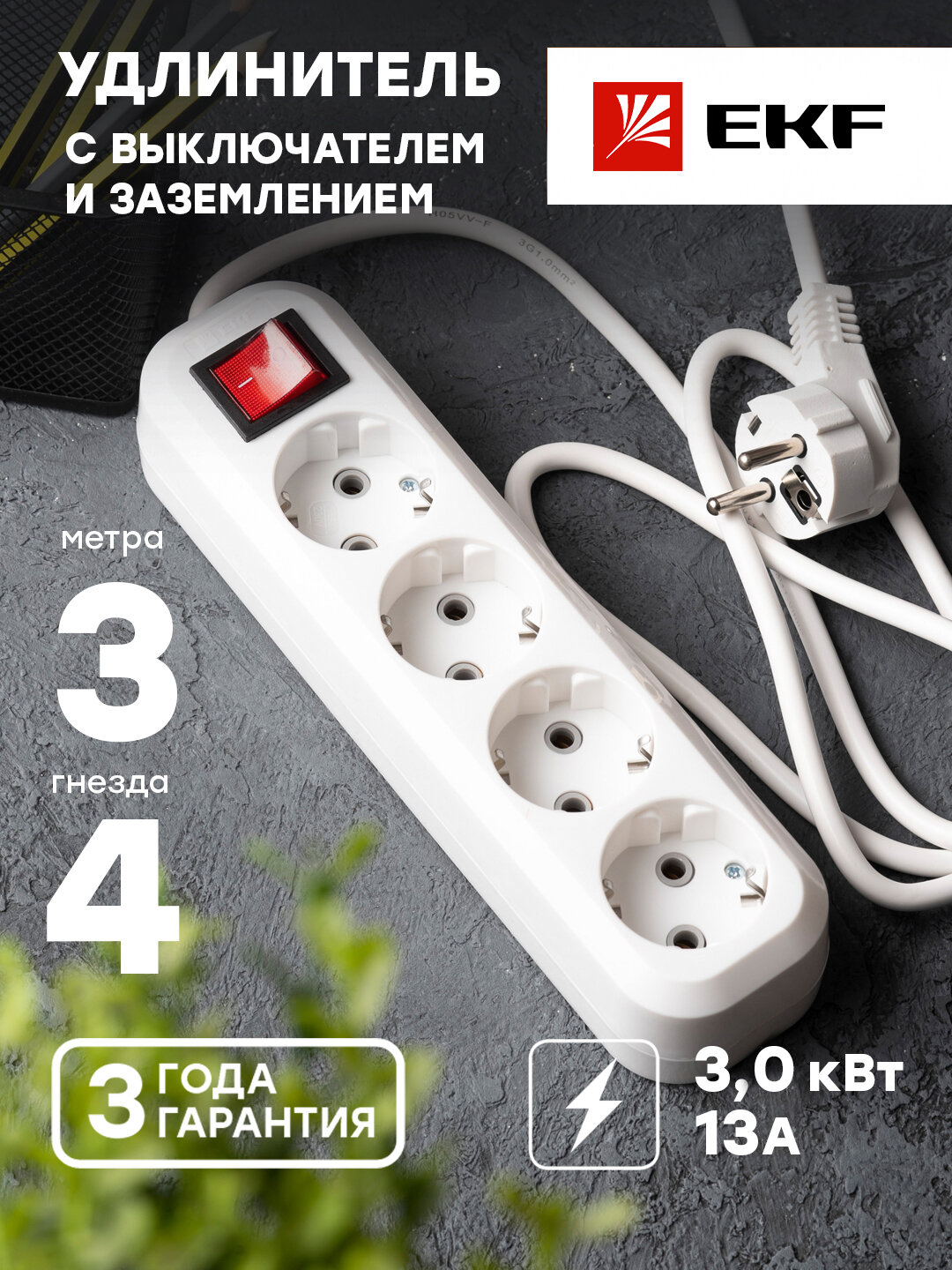 Удлинитель EKF Эксперт PROxima, 4 розетки, с/з, 16А / 3500 Вт белый 3 м 260 мм 120 мм 60 мм 1 м² 4