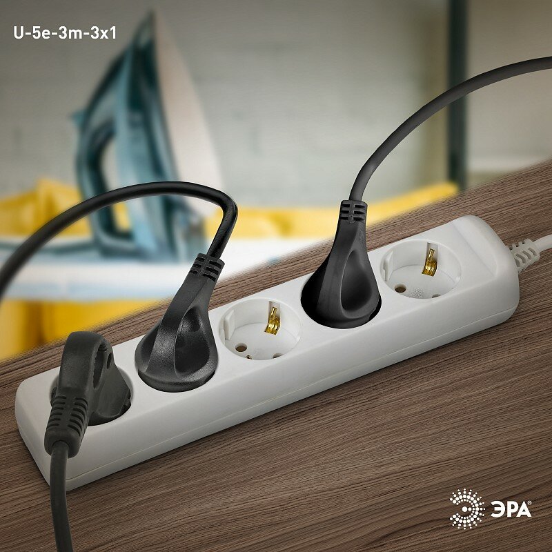 Удлинитель электрический ЭРА U-5e-3m-3x1 с заземлением 5 розеток 3м ПВС 3x1мм2 16А