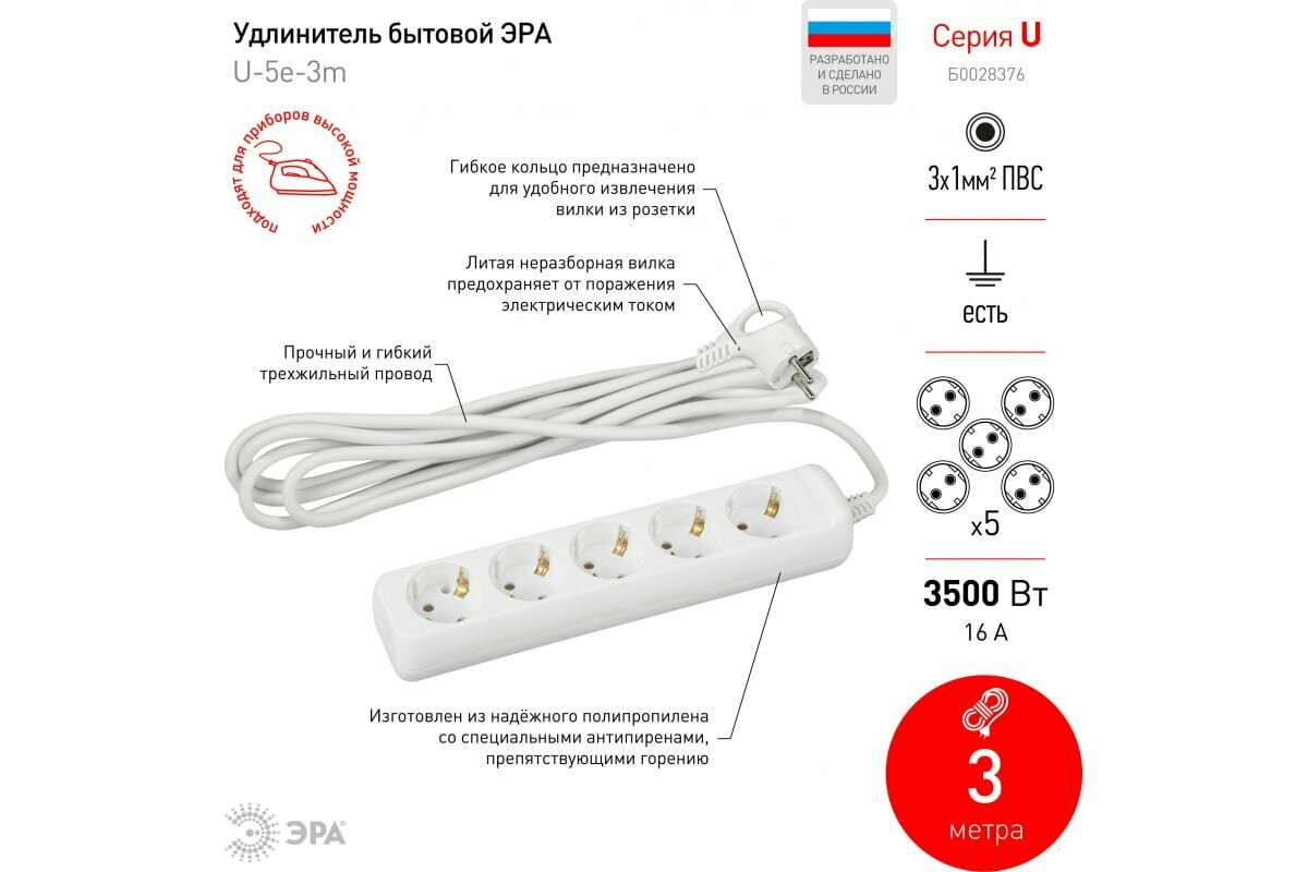 Удлинитель ЭРА U-5e-3m (Б0028376), 5 розеток, с/з, 16А / 3500 Вт белый 3 м 26 мм 10 мм 1 м² 5