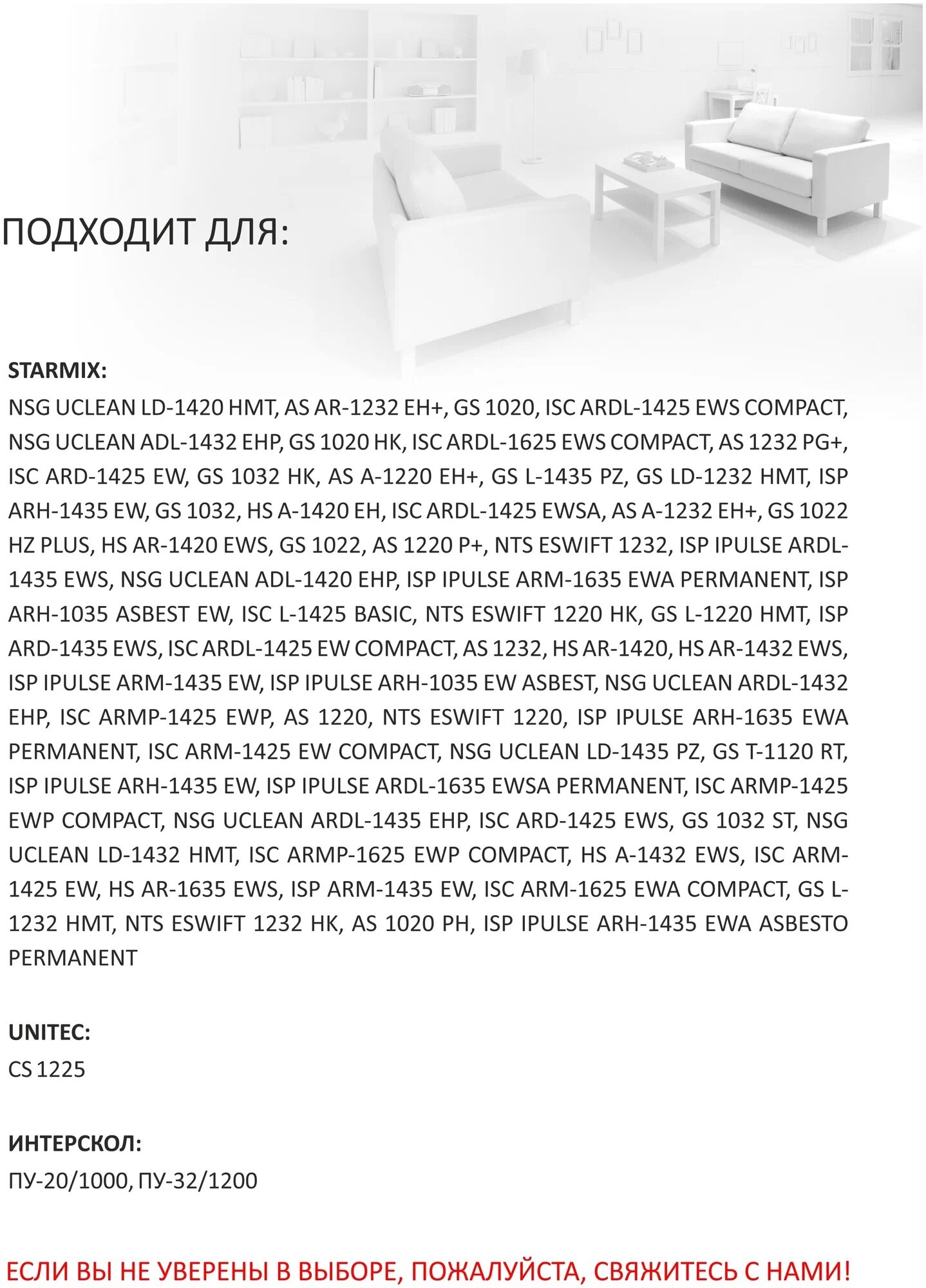 | Совместимые модели | AEG RSE 1400; BOSCH GAS 25;Eibenstock DSS 1225; DSS 1200; FELISATTI AS 20/1200; VC 25/1400 HITACHI RNT 1225; KRESS 1400; 140 RS/EA; METABO AS 1200;AS 1201;ASA 1201; ASA 1202;ASA 2002;ASR 2025; ASR 35L; STARMIX FB20; STARMIX FB32-35;STARMIX 1020; 1022; 1030;1032; STARMIX 1120; 1220; 1225; 1232; 1420; 1425; 1432; 1435; 1635; ИНТЕРСКОЛ ПУ-20/1000; ИНТЕРСКОЛ ПУ-32/1000 |