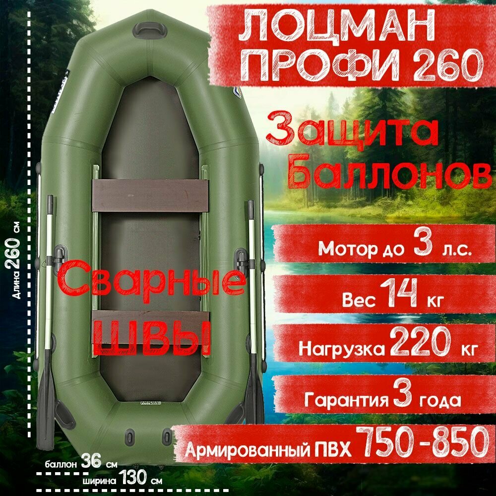 Лодка ПВХ Лоцман гребная под мотор Профи 260, зелёный