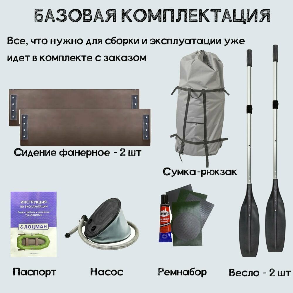 | Бортовое оснащение | якорный рым, леерный трос, весла, уключины, насос, ремкомплект |