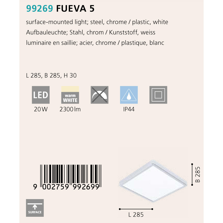 99268 Светодиод. накладной светильник FUEVA 5, 20W (LED), 285х285, H28, 2300lm, 3000K, IP44, сталь,