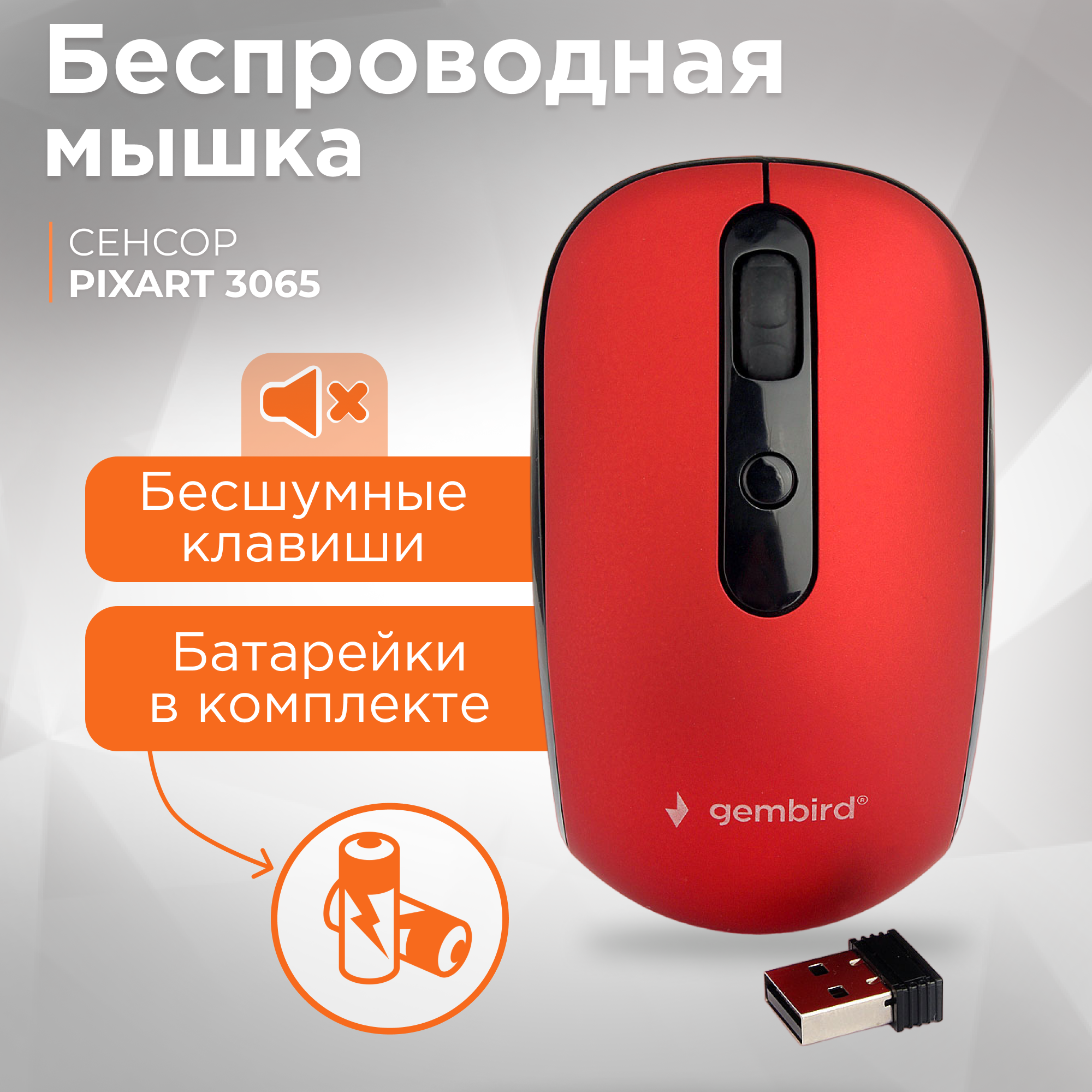 Беспроводная бесшумная мышь Gembird красная soft touch 1600DPI 2,4ГГц MUSW-355-R
