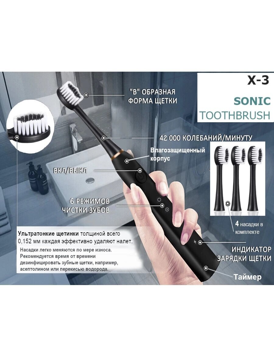 Электрическая зубная щетка SONIC TOOTHBRUSH X-3 / чёрная щётка / зубная щётка