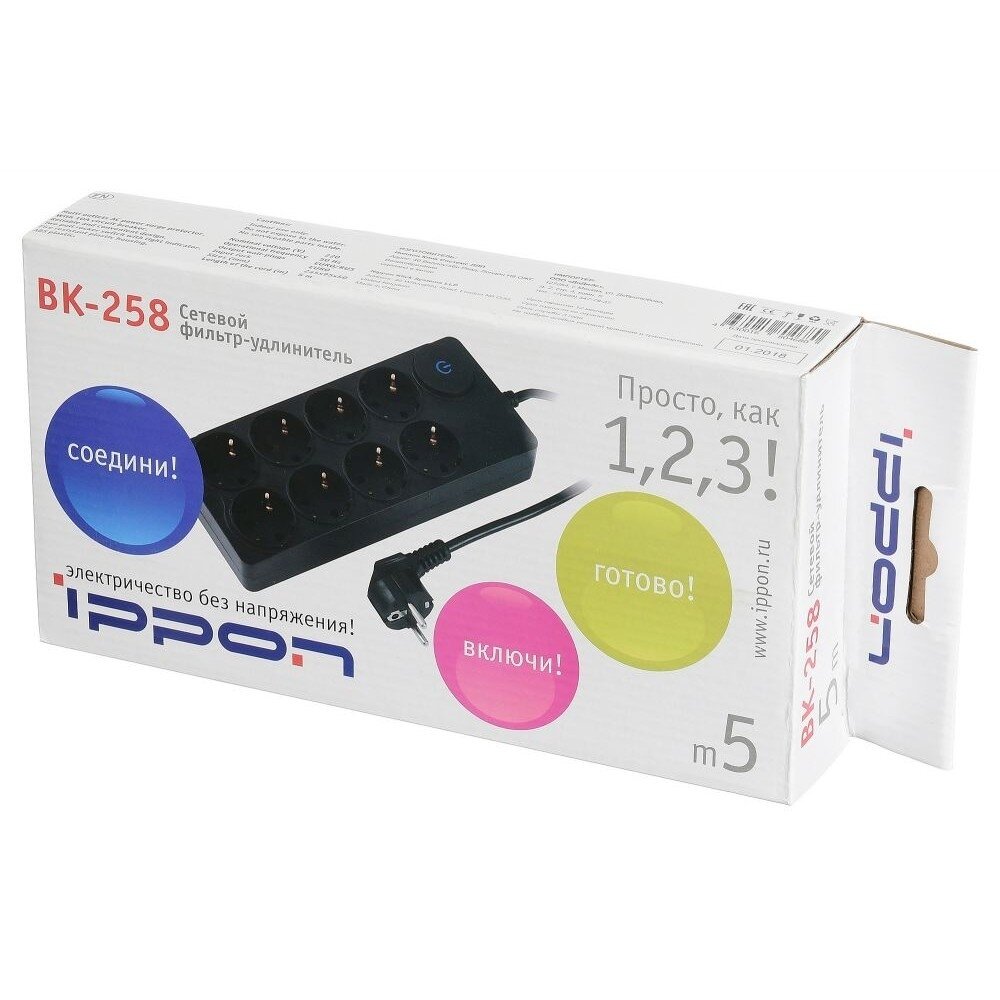Сетевой фильтр IPPON BK-258, 8 розеток, с/з, 10А / 2200 Вт черный 5 м
