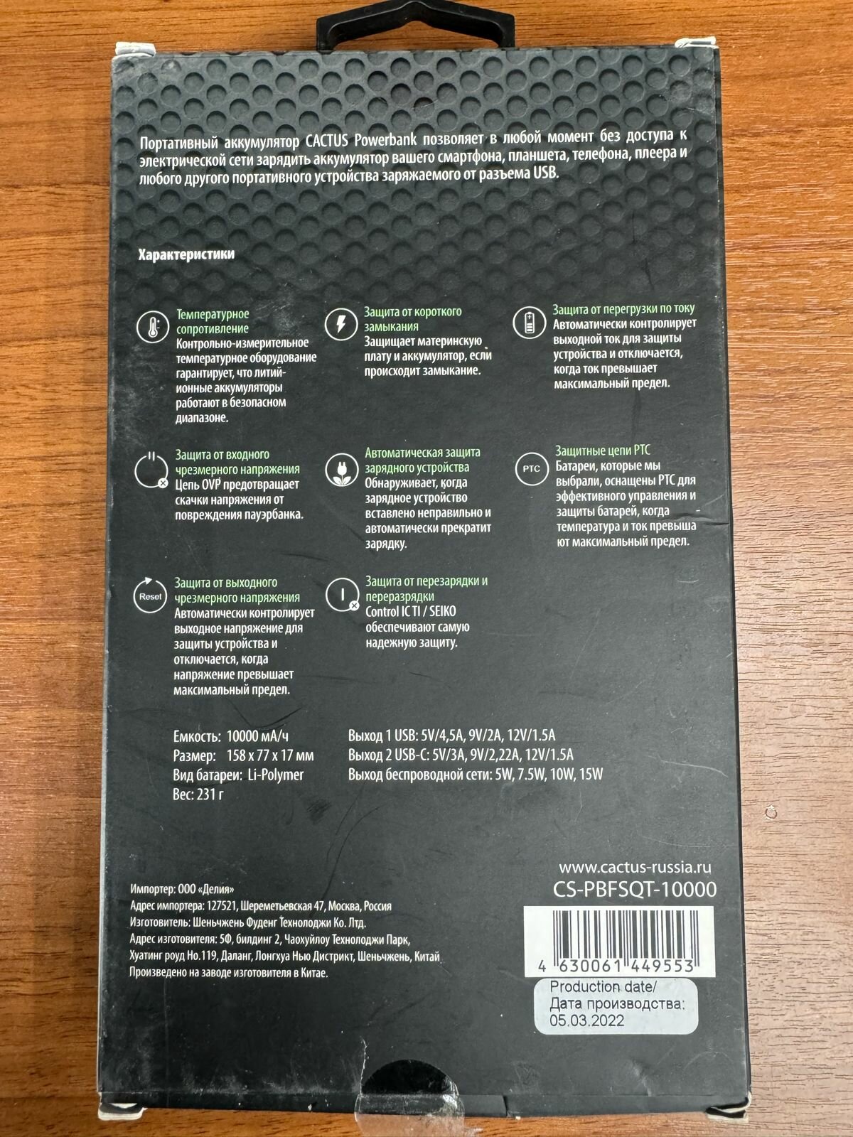 Мобильный аккумулятор Cactus CS-PBFSQT-10000 .