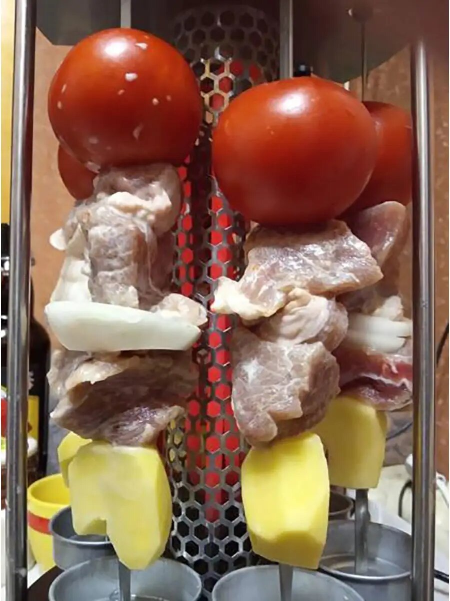 1)Свинина(быстрая мариновка в кефире с луком) ~55мин. 2)Курица(без мариновки с паприкой) ~35мин. Точно мелкие куски, нормального размера расквашиваются, а соприкасаемые с решёткой участки прикипят. 3)Люля(2/3 говядина, 1/3свинина) до 30 минут. Отбивайте посильнее. Снизу уместна картофелина, со свининой нормально, а у курицы не пропечётся. Необходим собственно подъём мяса на 5 см от чашки. Если курица сползла, нечё, она там пропечётся. Мясо не желательно чтобы было выше ширмы, сухие куски будут. Ручки шампуров нагреваются, не хватает гарды. С люля охотно оседал на ней жир. Хотел открутить верхнюю "крышку", чтоб почистить, но болты не поддавались, мягкие и нужна была свежая отвёртка. В результате , две поддались, но всё равно выкрутил вместе со стойкой, а она взаимосвязана с нижними ножками. В итоге заглянул внутрь.. залью фотку, может кому-нибудь что скажет. Привод по идее слабоват, но хватает.. |