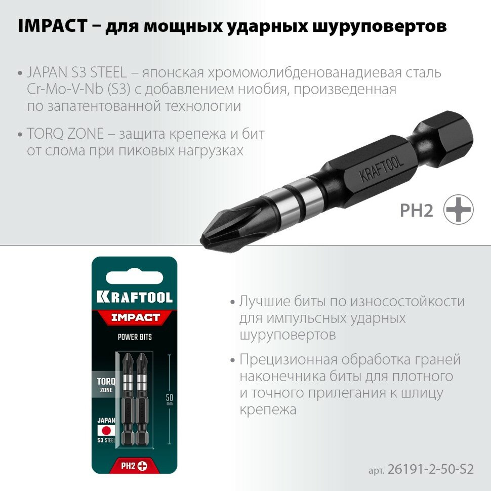 Биты KRAFTOOL Impact Pro, Philips, тип хвостовика E 1/4", PH2, 50мм, 2шт, на карточке