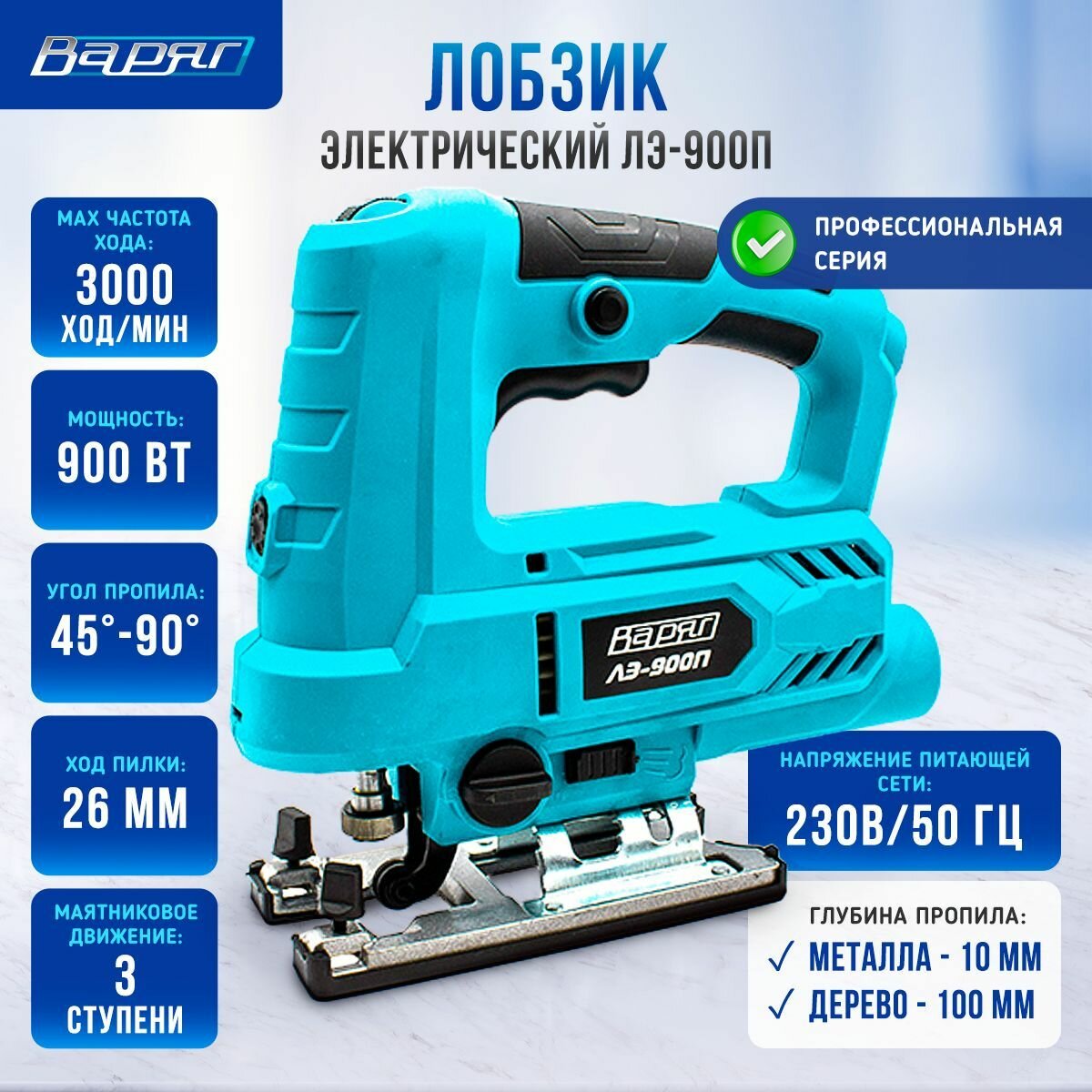 Лобзик электрический сетевой варяг ЛЭ-900П (900Вт, 0-3000об/мин, быстр. заж. пил, дер.110мм/метал.10мм) / электролобзик с регулировкой скорости и маятниковым режимом