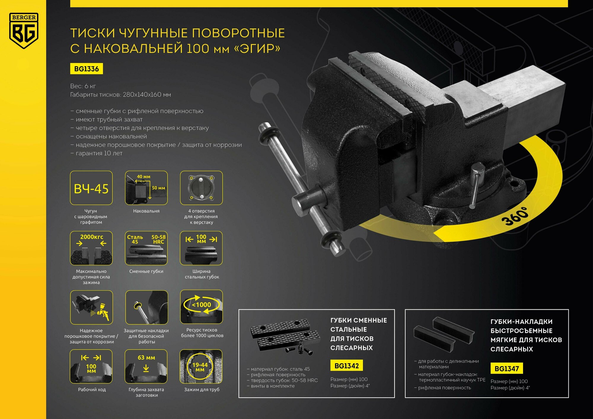 BG1336 Berger BG Тиски чугунные поворотные с трубным зажимом и наковальней Эгир 100мм BG1336 .