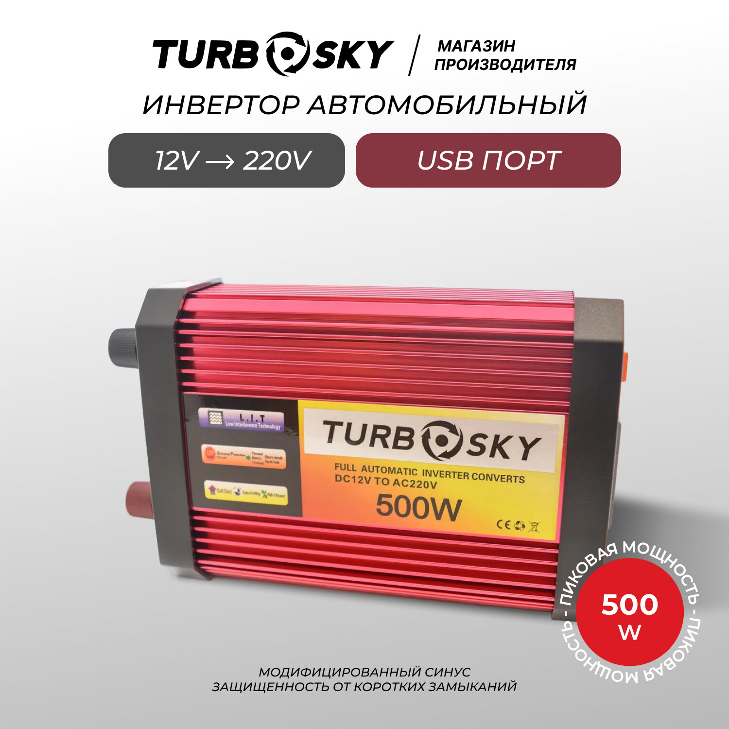 Инвертор Turbosky PI-500, Инвертор автомобильный 12 220 IN-500W, сеть 220В - там, где нужно / Преобразователь напряжения 12 в 220 Turbosky PI-500 с защитой от перегрузки и перегрева / Инвертор напряжения автомобильный 500Вт с Евророзеткой и USB, модифицир