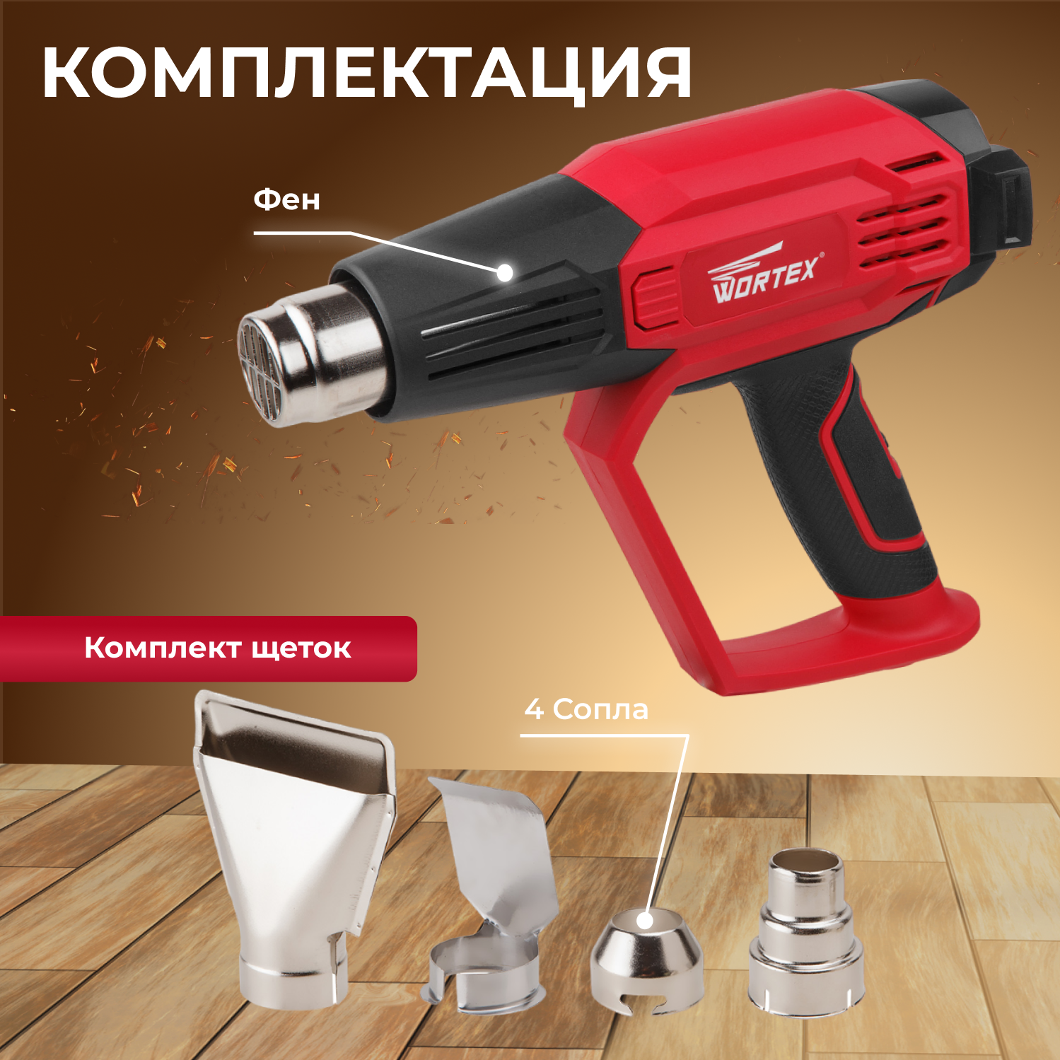 Термовоздуходувка WORTEX HG 6222 в кор. + набор сопл (2000 Вт, 3 скор., 90-600 °С, плавн. рег.) (HG622200011)