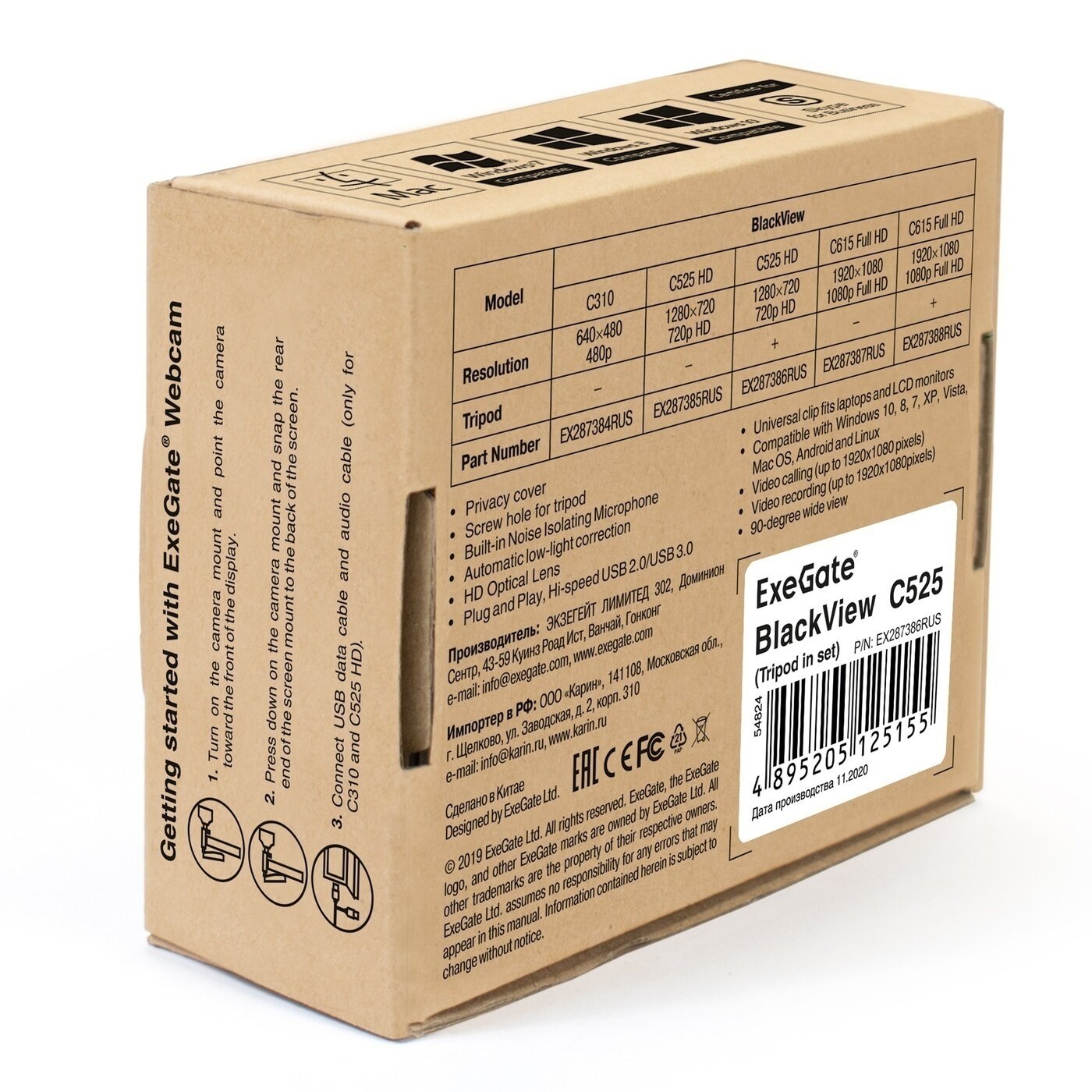 Купить Exegate EX287386RUS Веб-камера ExeGate BlackView C525 HD Tripod (матрица 1/3 1,3 Мп, 1280х720, 720P, 30fps, 4-линзовый объектив, USB+35mm Jack, фиксир